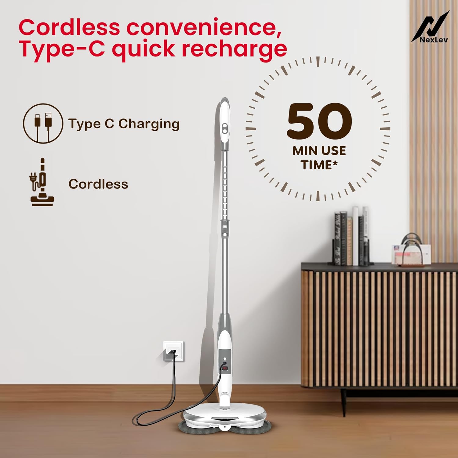- DOUBLE SPIN HEAD: Equipped with dual motors spinning at 180 RPM, the Nexlev Swipe+ effortlessly tackles stubborn stains and dirt on any surface.