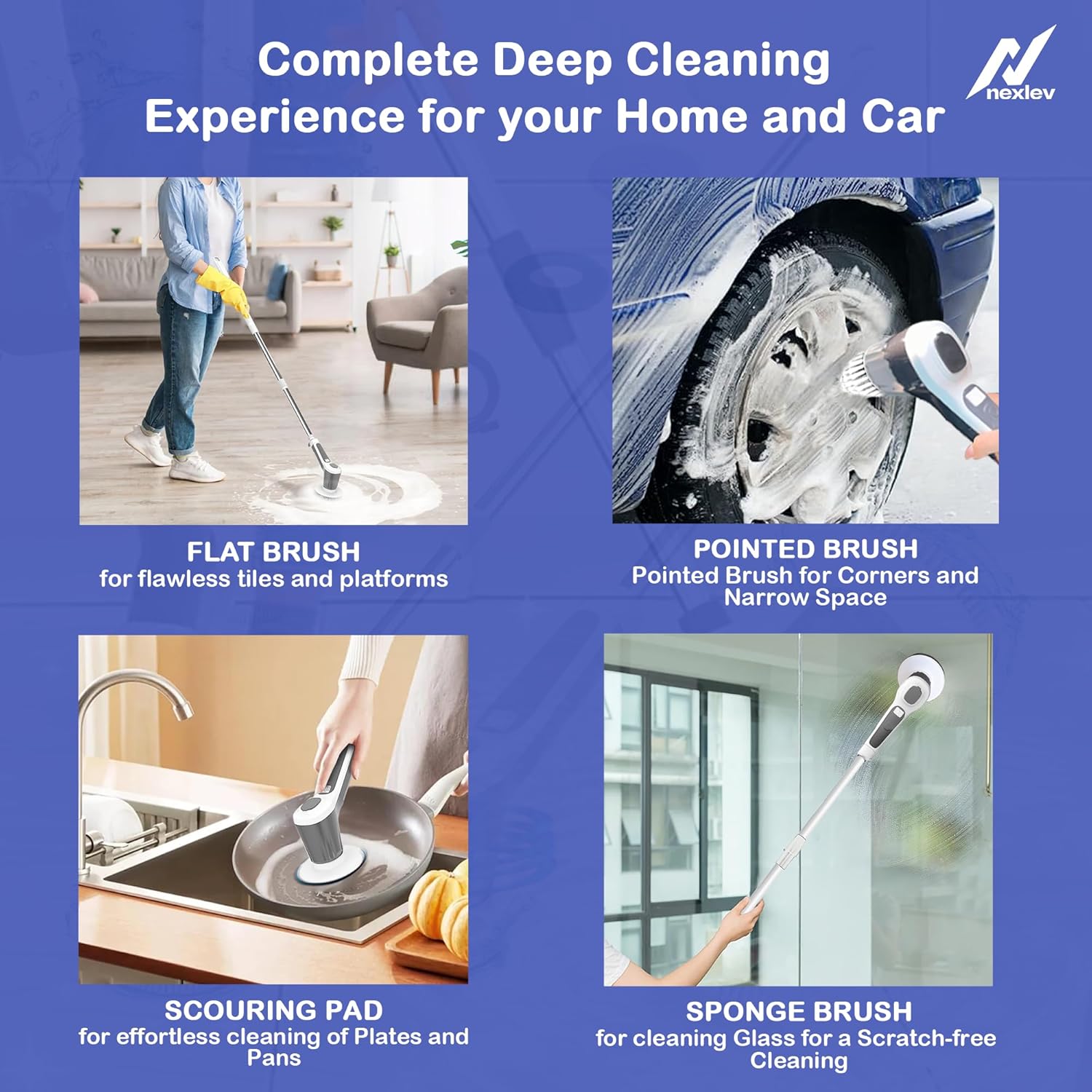 - ACCESSORIES & FEATURES: The Nexlev Spin Scrubber includes a retractable telescopic handle with anti-skid threading, six changeable brush heads, and an LED display, ensuring deep cleaning of even the toughest corners.